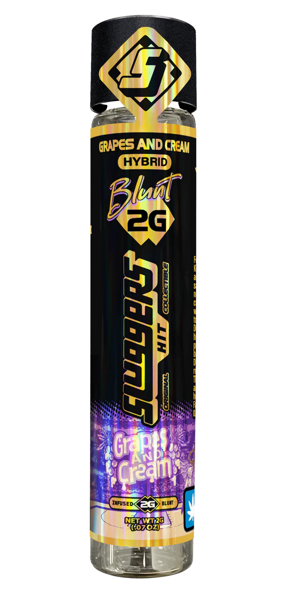 Sluggers x Viola Collab presents a 2g Blunt filled with premium flower, rosin, and diamonds, all wrapped in a hemp leaf and tipped with a corn husk filter, providing a fruity, sweet, and creamy acidic experience. Order Sluggers hit blunt Grapes/Cream now!