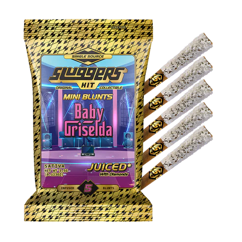 Inspired by the iconic life of Griselda Blanco – This Special Edition, 5-Pack Mini Blunts is in collaboration with Blanco Family Farms & is dusted with THCa Diamonds. The artwork pays homage to Griselda & Miami in the 70s. Went deep with a gangster film mashup containing Easter Egg references from Scarface to Godfather to Pulp Fiction — all encompassed in the legendary Mutiny Hotel. Order Sluggers hit mini-blunt Baby Griselda online