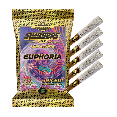This 5-pack of Euphoria includes premium flower, liquid diamonds, and is rolled in diamonds. It has a floral, gassy taste with a hint of acidity in the finish. Order Sluggers hit mini-blunt Euphoria online..