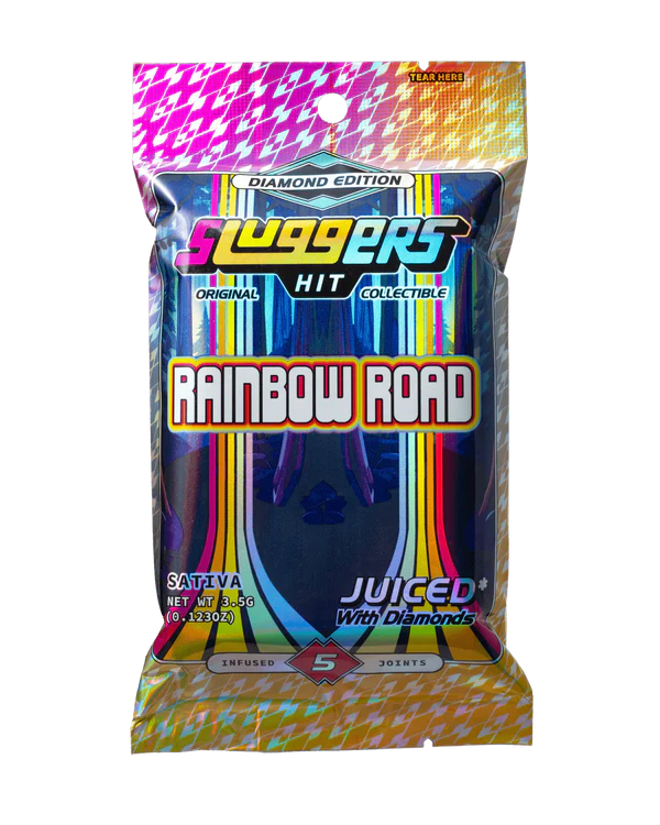Get into the vibe with our fruity, acidic, sweet Juiced* 5-pack of Rainbow Road, including premium flower, solventless hash, liquid diamonds, and a diamond coating. A ride worth riding, RAINBOW ROAD is a colorful bright trip down memory lane with all the fruits rolled up in one flavorful trip. Order sluggers hit Rainbow Road online